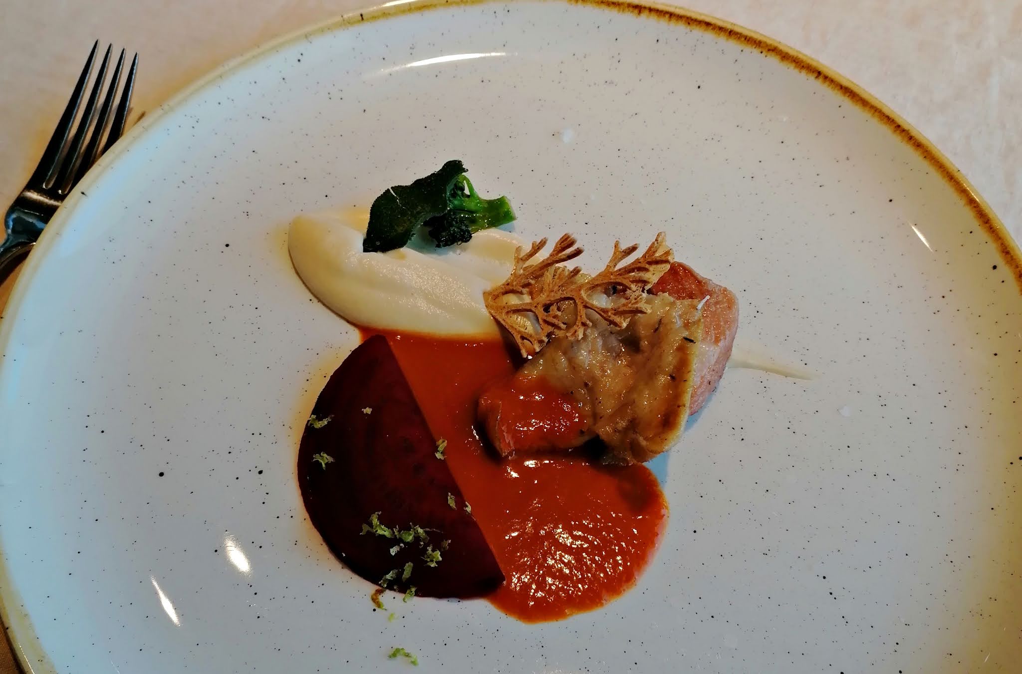 Am avut parte de o experienta care mi-a placut mult si pe care o poate incerca oricine ajunge in zona asta vineri sau sambata seara -  un meniu fine dining la Restaurantul Fork. Ce vedeti in poza este secreto de mangalita cu piure de conopida, ciuperci de padure, sfecla si sos de ghiveci. Se pot organiza meniuri de degustare cu 5 feluri, combinate sau nu cu wine pairing si daca va duceti in zona e o experienta care merita incercata. Mai sunt inca 2 restaurante: Forest unde se pot organiza si evenimente private si Gastrolab, mult mai rustic si cu preparate traditionale.